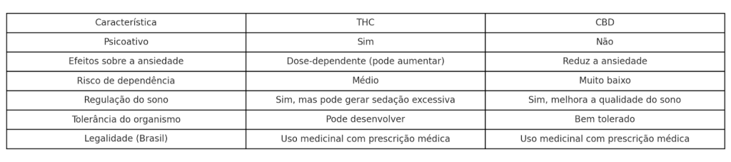 Já o THC, embora também tenha sido estudado, apresentou resultados inconsistentes: em alguns pacientes promove alívio, em outros aumenta os sintomas de ansiedade, especialmente em doses altas ou em indivíduos predispostos.